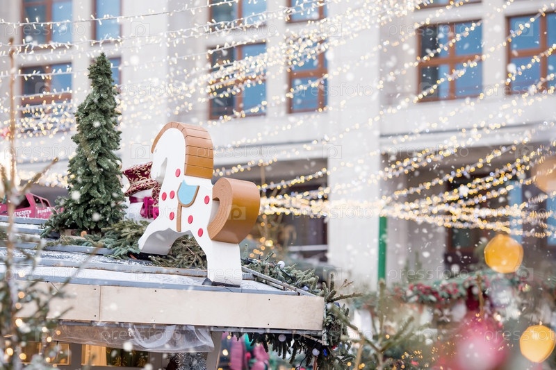 Новый год 2025. Новогодние украшения и игрушки на улицах города. Рождественские праздники, зимний новогодний декор в центре Москвы