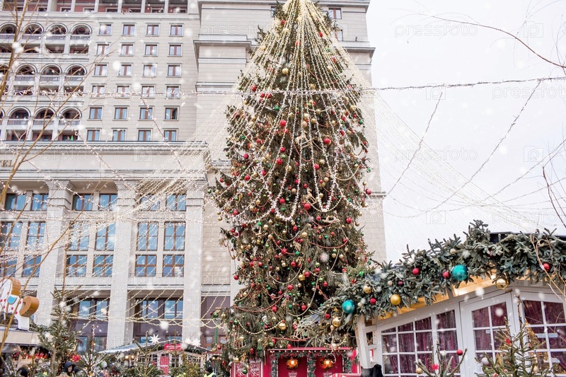 Новый год 2025. Новогодние украшения и игрушки на улицах города. Рождественские праздники, зимний новогодний декор в центре Москвы