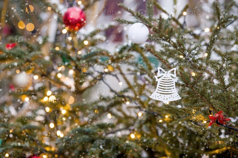 Красивые праздничные украшения на елке. Крупный план. Красивый рождественский фон. Концепция украшений и декора на новый год. Новогодняя открытка 2025