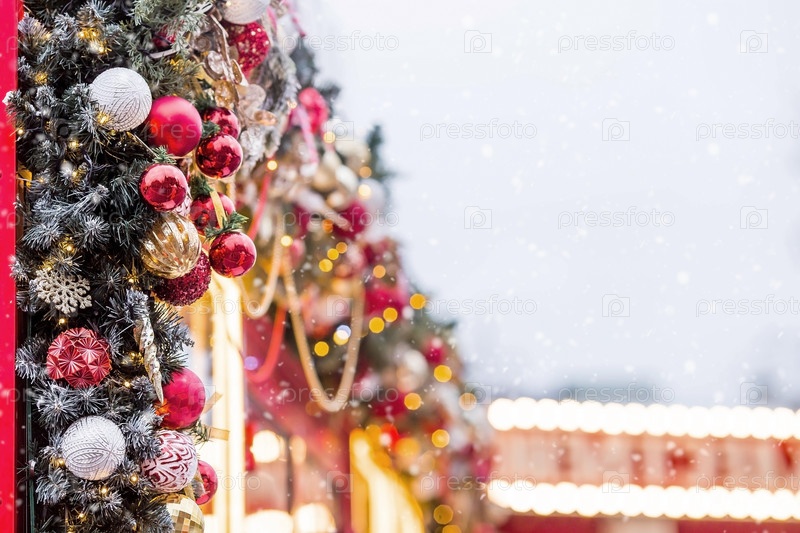 Красивые праздничные украшения на елке. Крупный план. Красивый рождественский фон. Концепция украшений и декора на новый год. Новогодняя открытка 2025