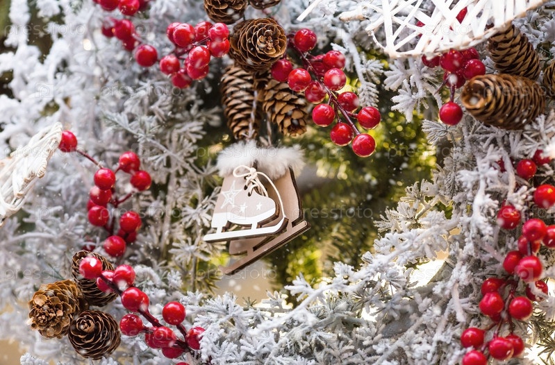 Красивые праздничные украшения на елке. Крупный план. Красивый рождественский фон. Концепция украшений и декора на новый год. Новогодняя открытка 2025