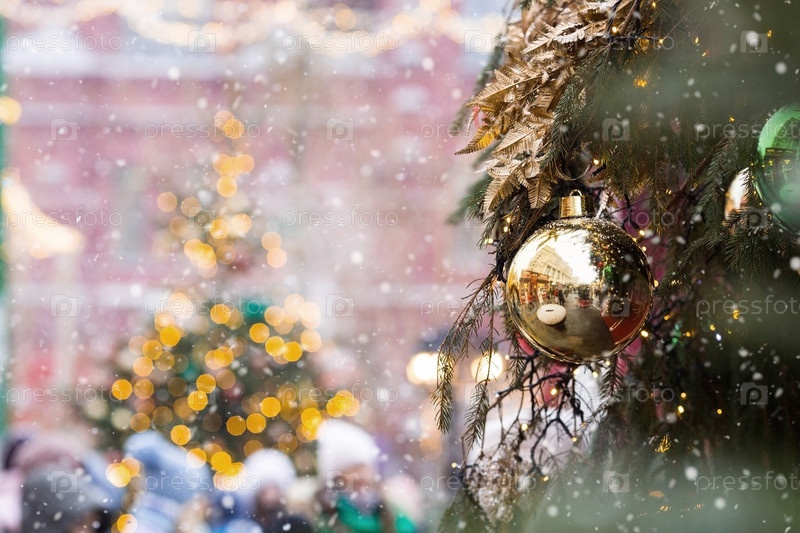 Красивые праздничные украшения на елке. Крупный план. Красивый рождественский фон. Концепция украшений и декора на новый год. Новогодняя открытка 2025