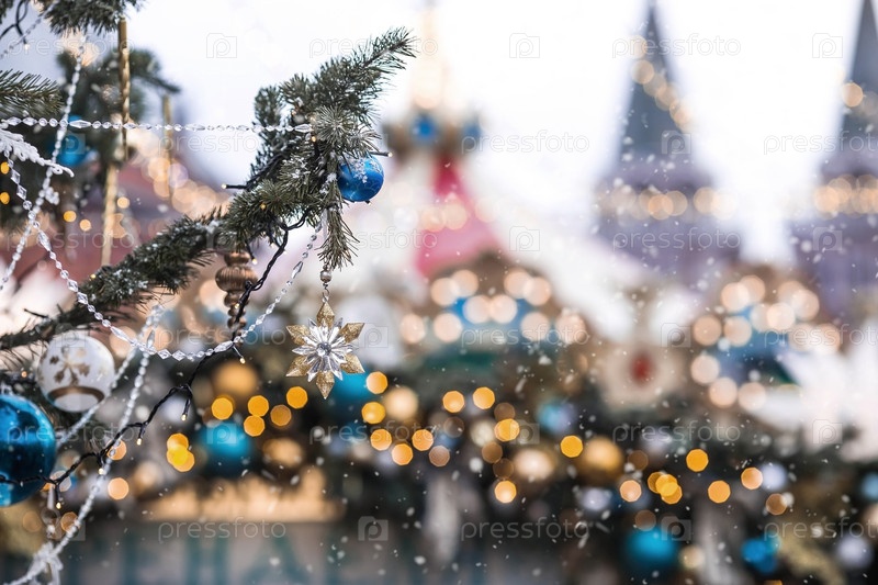 Красивые праздничные украшения на елке. Крупный план. Красивый рождественский фон. Концепция украшений и декора на новый год. Новогодняя открытка 2025