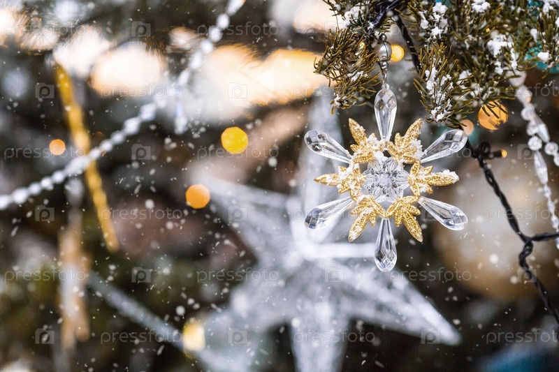 Красивое праздничное украшение снежинки на елку. Крупный план. Красивый рождественский фон. Концепция украшений и декора на новый год. Новогодняя открытка 2025