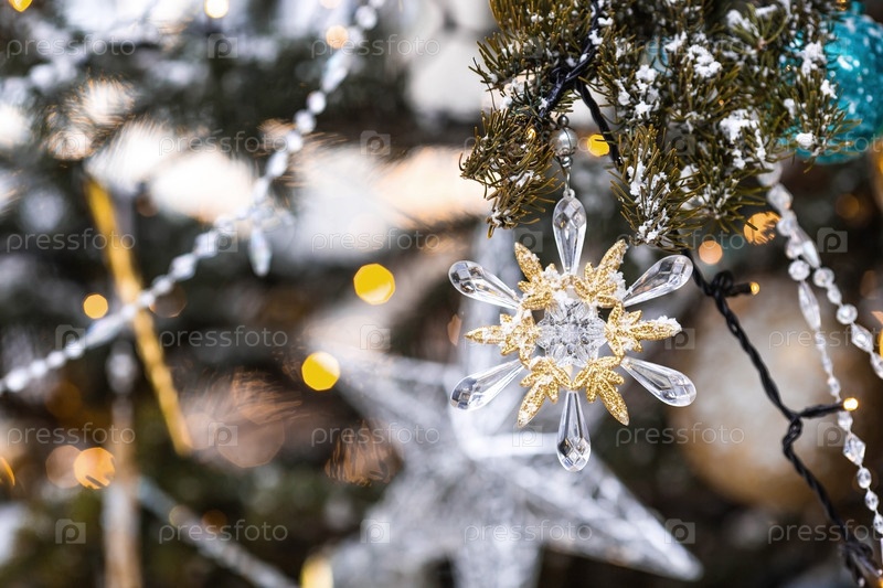 Красивое праздничное украшение снежинки на елку. Крупный план. Красивый рождественский фон. Концепция украшений и декора на новый год. Новогодняя открытка 2025