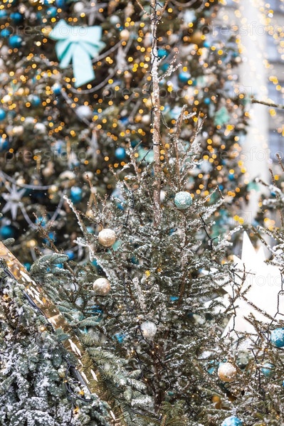 Красивые праздничные украшения на елке. Крупный план. Красивый рождественский фон. Концепция украшений и декора на новый год. Новогодняя открытка 2025