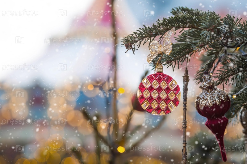 Красивые праздничные украшения на елке. Крупный план. Красивый рождественский фон. Концепция украшений и декора на новый год. Новогодняя открытка 2025
