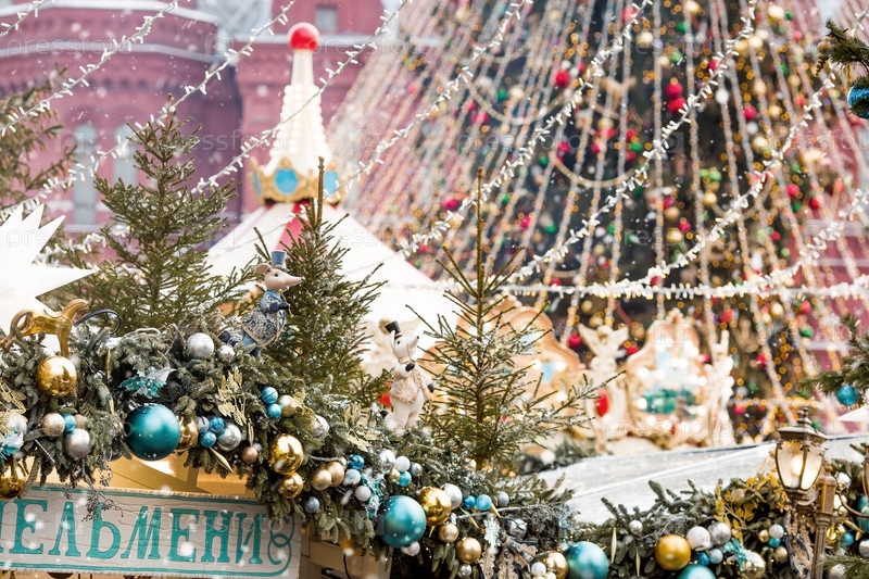 Новый год 2025. Новогодние украшения и игрушки на улицах города. Рождественские праздники, зимний новогодний декор в центре Москвы