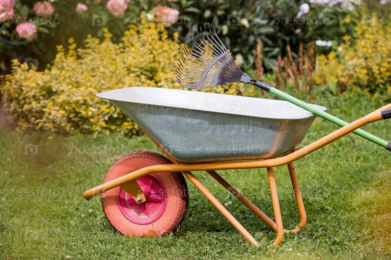 Садовая тачка и грабли на заднем дворе дома. Концепция работы по дому, садоводства и загородной жизни. Подготовка сада к осени и зиме. Закрытие летнего сезона