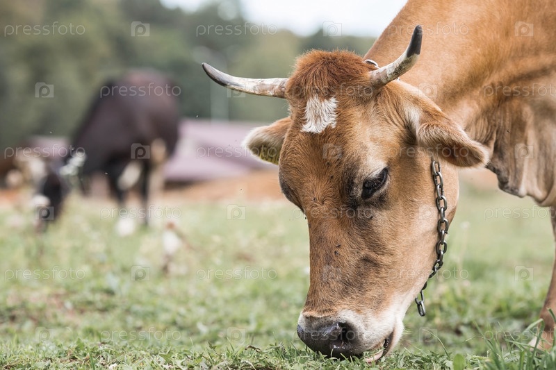 Домашний скот. Коровы пасутся на лугу. Концепция животноводства и сельской жизни. Чипирование животных. Питомец на экоферме. Сельскохозяйственная промышленность