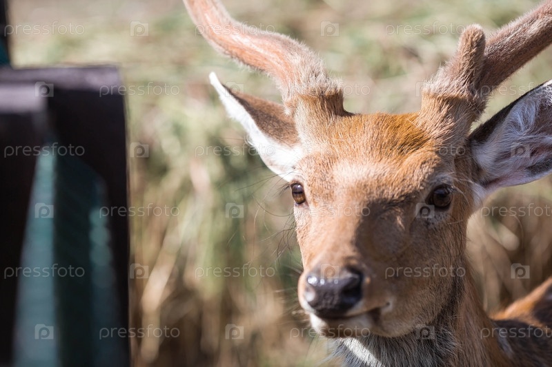 Портрет. Маленький олененок гуляет в загоне на ранчо, на частной экоферме или в контактном зоопарке. Животноводство. Любовь к животным