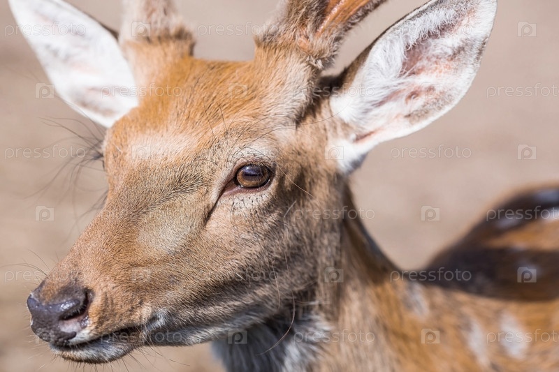 Портрет. Маленький олененок гуляет в загоне на ранчо, на частной экоферме или в контактном зоопарке. Животноводство. Любовь к животным