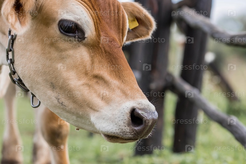 Домашний скот. Коровы пасутся на лугу. Концепция животноводства и сельской жизни. Чипирование животных. Питомец на экоферме. Сельскохозяйственная промышленность