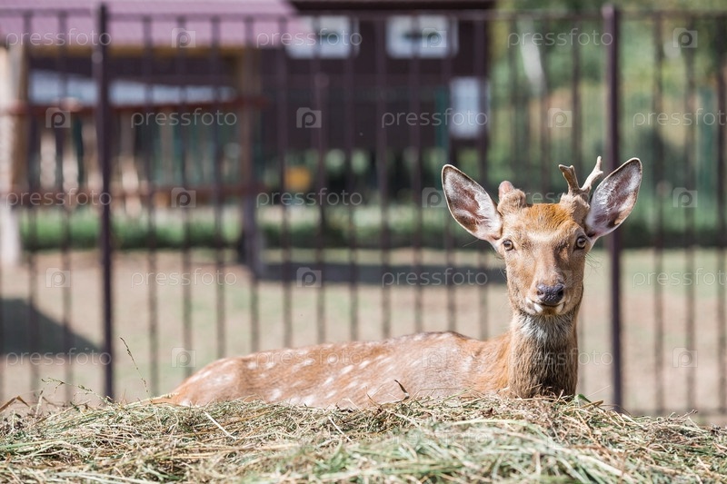Портрет. Маленький олененок гуляет в загоне на ранчо, на частной экоферме или в контактном зоопарке. Животноводство. Любовь к животным