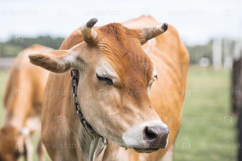 Домашний скот. Коровы пасутся на лугу. Концепция животноводства и сельской жизни. Чипирование животных. Питомец на экоферме. Сельскохозяйственная промышленность