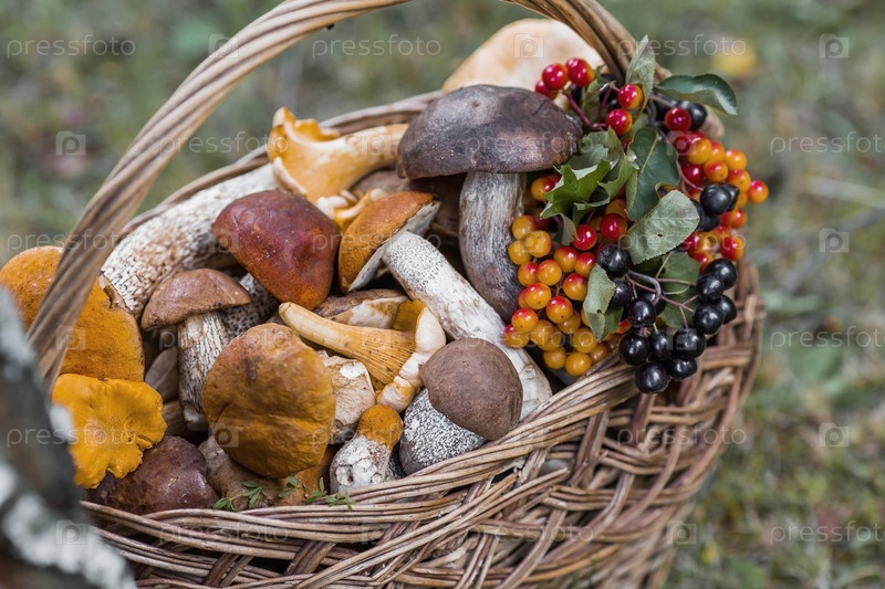Благородные съедобные грибы. Ассорти из грибов в красивой плетеной корзине в березовом лесу. Красивая текстура естественного фона