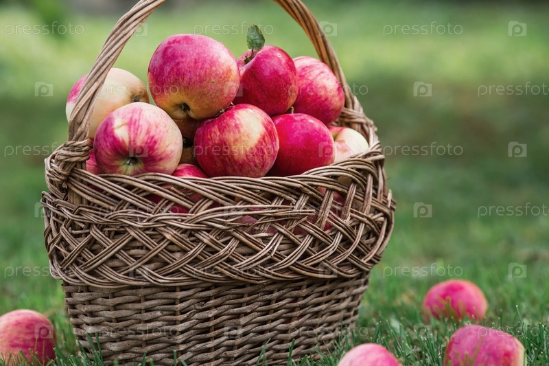 Плетеная корзина, полная свежих фруктов. Корзина с красными яблоками. Прекрасный солнечный свет. Осенний урожай, сбор урожая или заготовка