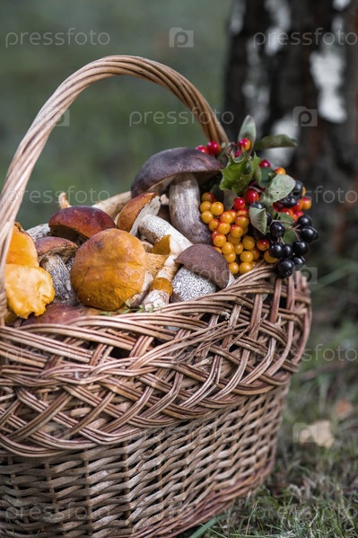 Благородные съедобные грибы. Ассорти из грибов в красивой плетеной корзине в березовом лесу. Красивая текстура естественного фона