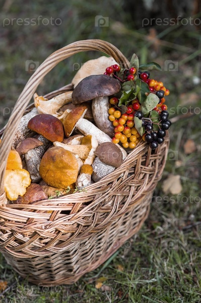 Благородные съедобные грибы. Ассорти из грибов в красивой плетеной корзине в березовом лесу. Красивая текстура естественного фона