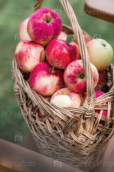Плетеная корзина, полная свежих фруктов. Корзина с красными яблоками. Прекрасный солнечный свет. Осенний урожай, сбор урожая или заготовка
