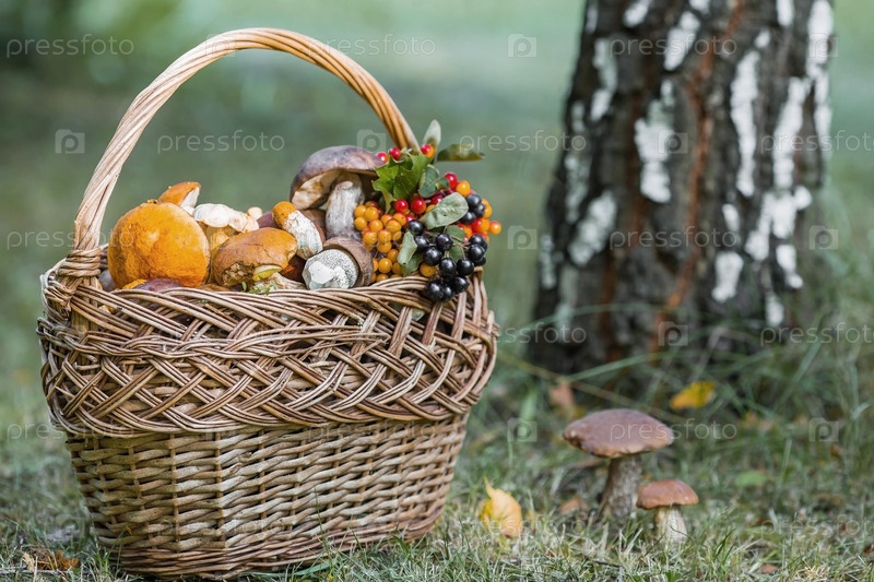 Благородные съедобные грибы. Ассорти из грибов в красивой плетеной корзине в березовом лесу. Красивая текстура естественного фона