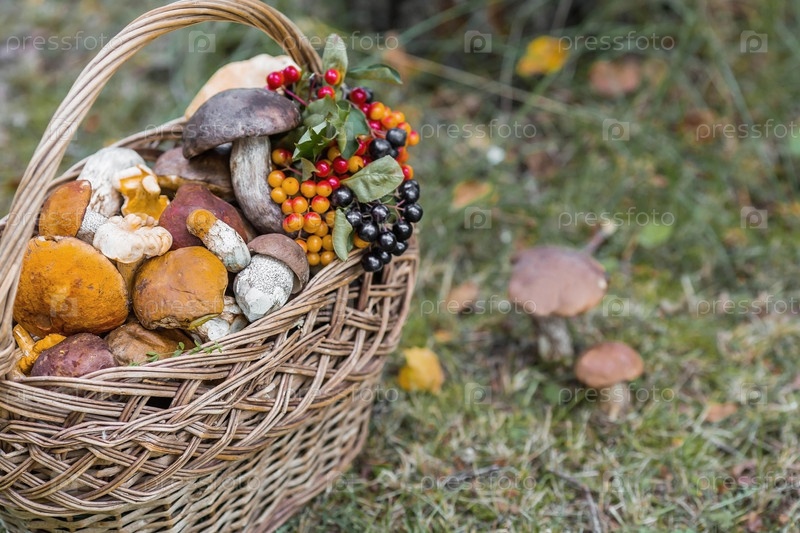 Благородные съедобные грибы. Ассорти из грибов в красивой плетеной корзине в березовом лесу. Красивая текстура естественного фона
