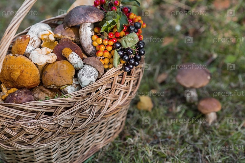 Благородные съедобные грибы. Ассорти из грибов в красивой плетеной корзине в березовом лесу. Красивая текстура естественного фона