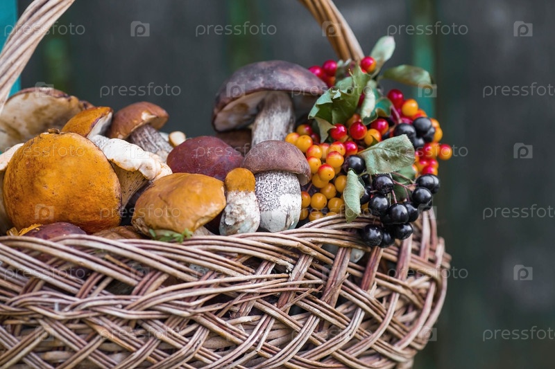 Благородные съедобные грибы. Ассорти из грибов в красивой плетеной корзине в березовом лесу. Красивая текстура естественного фона