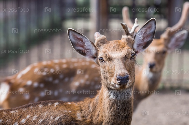 Портрет. Маленький олененок гуляет в загоне на ранчо, на частной экоферме или в контактном зоопарке. Животноводство. Любовь к животным