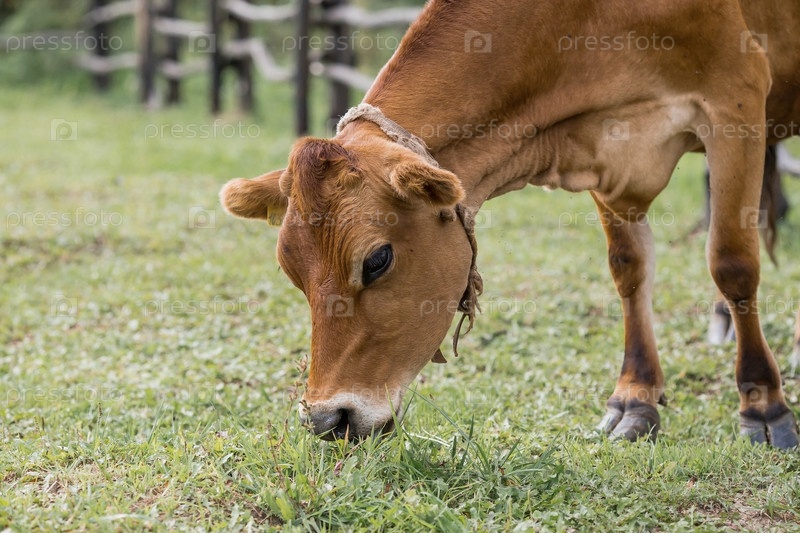 Домашний скот. Коровы пасутся на лугу. Концепция животноводства и сельской жизни. Чипирование животных. Питомец на экоферме. Сельскохозяйственная промышленность