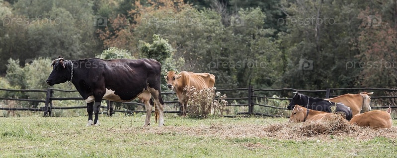 Домашний скот. Коровы пасутся на лугу. Концепция животноводства и сельской жизни. Чипирование животных. Питомец на экоферме. Сельскохозяйственная промышленность