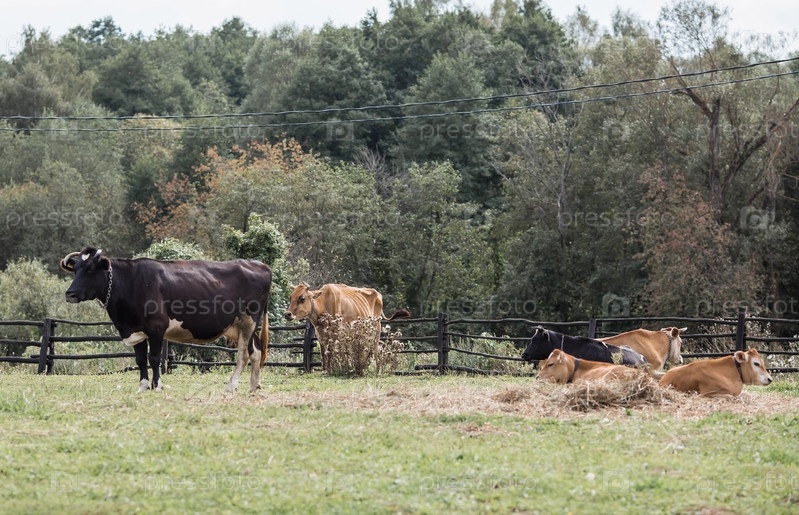 Домашний скот. Коровы пасутся на лугу. Концепция животноводства и сельской жизни. Чипирование животных. Питомец на экоферме. Сельскохозяйственная промышленность