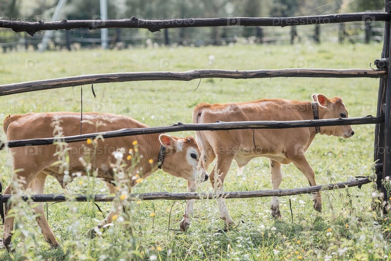 Домашний скот. Коровы пасутся на лугу. Концепция животноводства и сельской жизни. Чипирование животных. Питомец на экоферме. Сельскохозяйственная промышленность