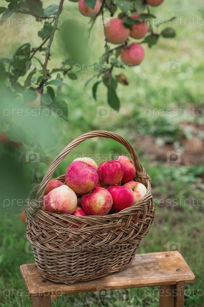 Плетеная корзина, полная свежих фруктов. Корзина с красными яблоками. Прекрасный солнечный свет. Осенний урожай, сбор урожая или заготовка