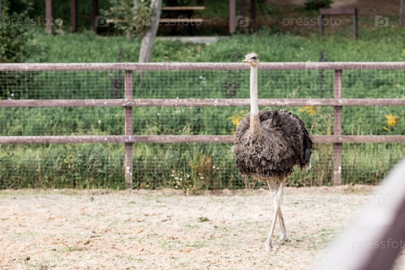 Домашняя птица. Портрет страуса в загоне. Концепция животноводства и сельской жизни. Крупный план. Питомец на экоферме. Сельскохозяйственная промышленность