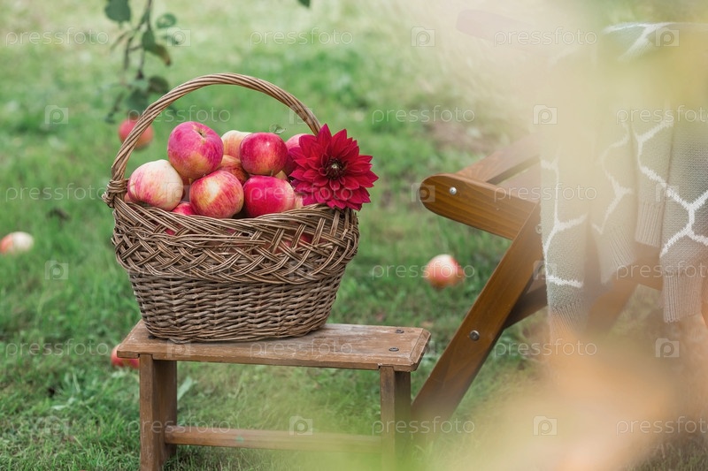 Плетеная корзина, полная свежих фруктов. Корзина с красными яблоками. Прекрасный солнечный свет. Осенний урожай, сбор урожая или заготовка