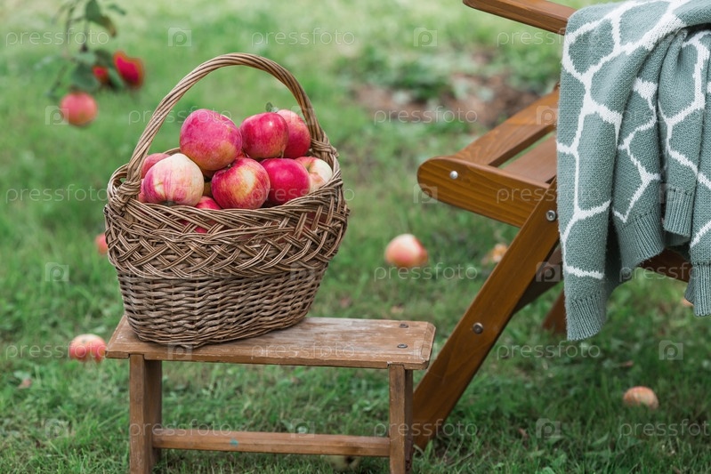 Плетеная корзина, полная свежих фруктов. Корзина с красными яблоками. Прекрасный солнечный свет. Осенний урожай, сбор урожая или заготовка