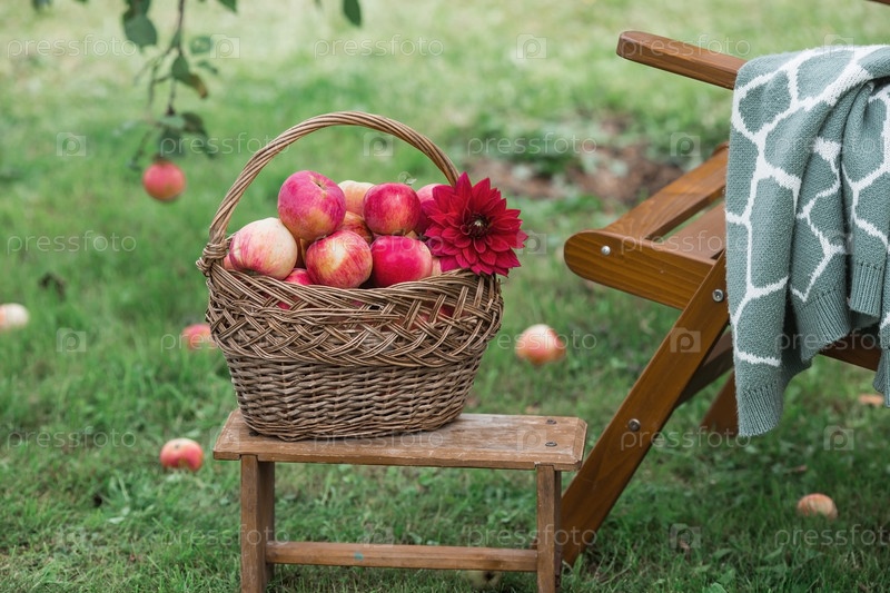 Плетеная корзина, полная свежих фруктов. Корзина с красными яблоками. Прекрасный солнечный свет. Осенний урожай, сбор урожая или уборка урожая