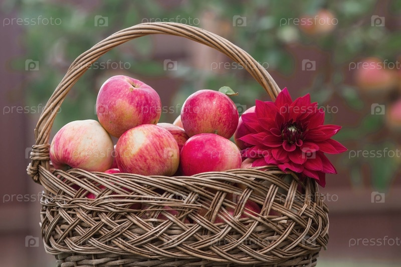Плетеная корзина, полная свежих фруктов. Корзина с красными яблоками. Прекрасный солнечный свет. Осенний урожай, сбор урожая или заготовка