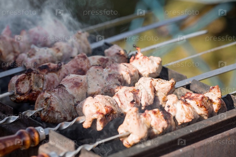 Свиной шашлык на даче на природе. Майские праздники. Свиной шашлык на шампурах. Процесс приготовления мяса на мангале с дымком, крупный план