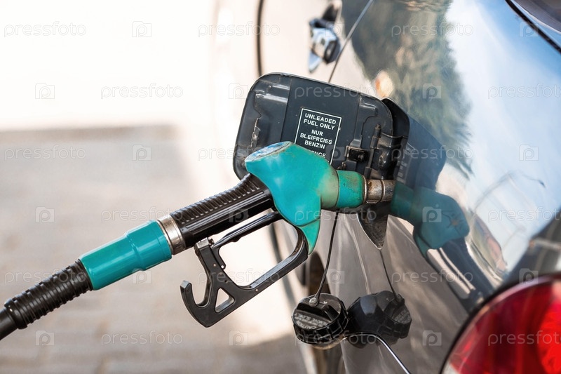АЗС. Заправка автомобиля бензином. Российский топливораздаточный пистолет в топливном баке автомобиля на АЗС. Рост цен на топливо по всему миру