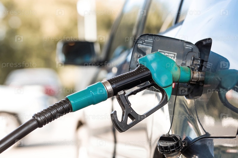 АЗС. Заправка автомобиля бензином. Российский топливораздаточный пистолет в топливном баке автомобиля на АЗС. Рост цен на топливо по всему миру