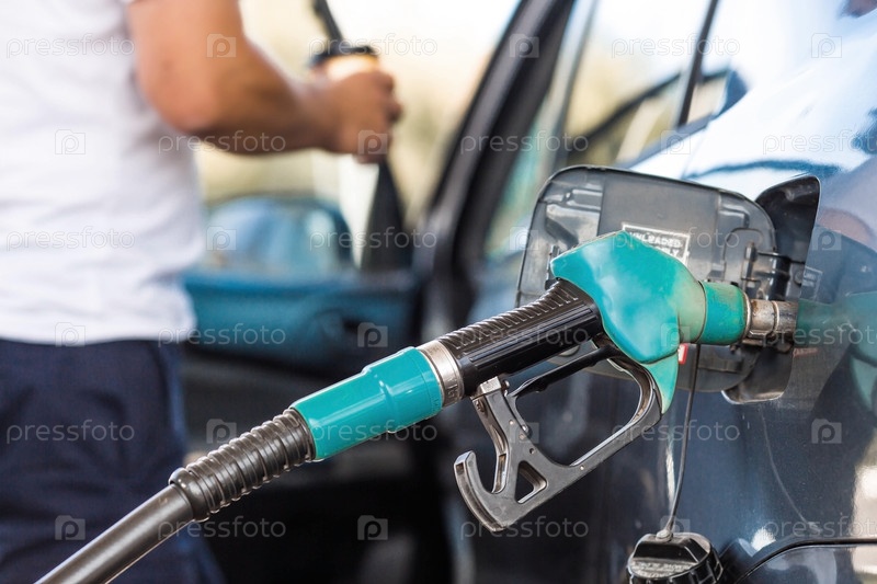 АЗС. Заправка автомобиля бензином. Российский топливораздаточный пистолет в топливном баке автомобиля на АЗС. Рост цен на топливо по всему миру