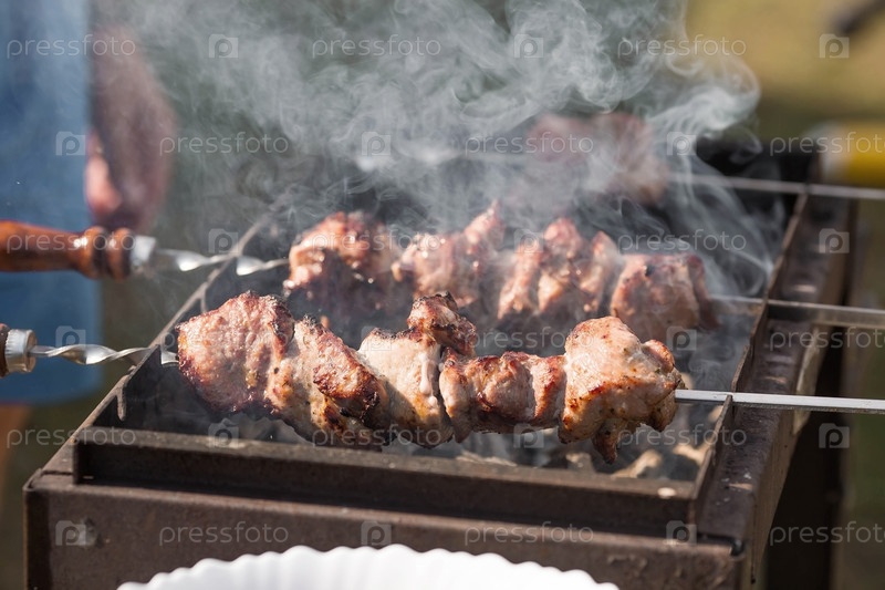 Свиной шашлык на даче на природе. Майские праздники. Свиной шашлык на шампурах. Процесс приготовления мяса на мангале с дымком, крупный план