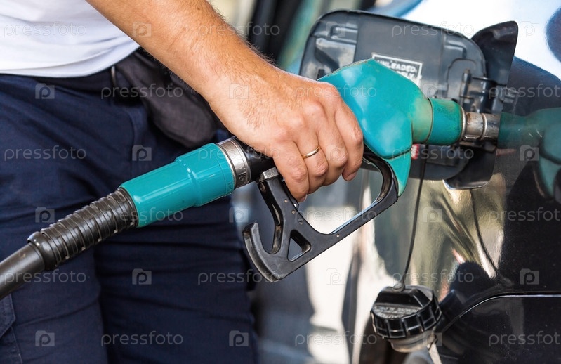 АЗС. Мужчина заправляет машину бензином. Российский топливораздаточный пистолет в топливном баке автомобиля на АЗС. Рост цен на топливо по всему миру