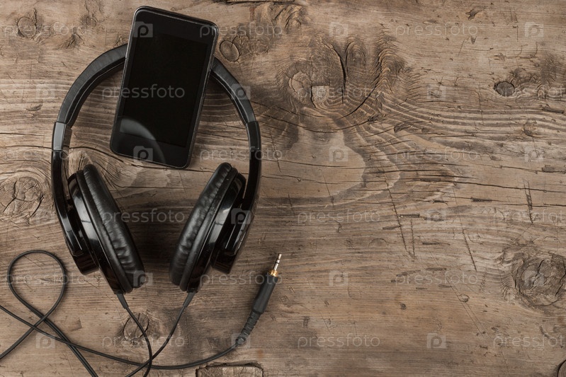 Смартфон с наушниками на старом деревянном столе