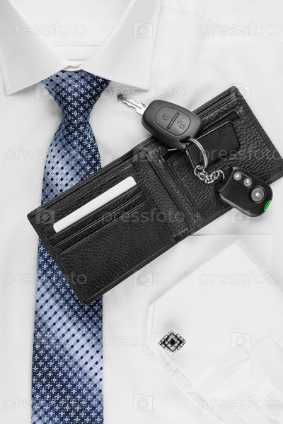 Бумажник, ключи лежат на рубашке и галстуке