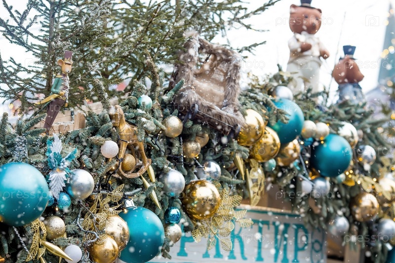 Новый год 2025. Новогодние украшения и игрушки на улицах города. Рождественские праздники, зимний новогодний декор в центре Москвы
