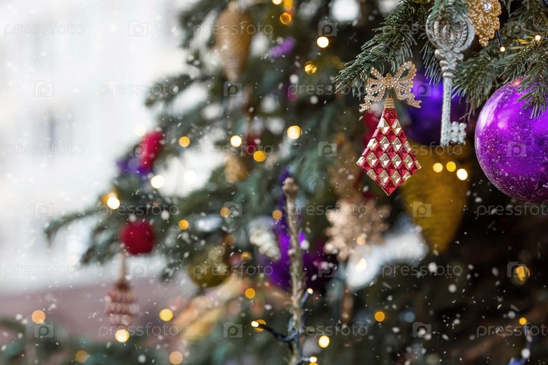 Красивые праздничные украшения на елке. Крупный план. Красивый рождественский фон. Концепция украшений и декора на новый год. Новогодняя открытка 2025