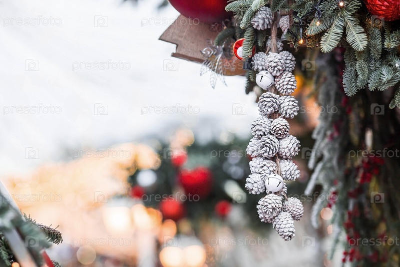 Красивые праздничные украшения на елке. Крупный план. Красивый рождественский фон. Концепция украшений и декора на новый год. Новогодняя открытка 2025